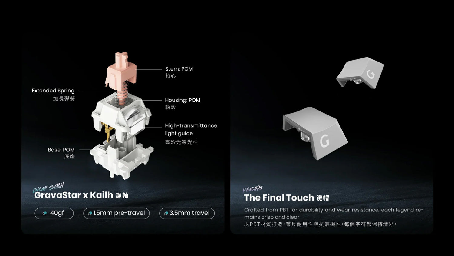 與軸體大廠 Kailh 合作,獨家開發 GravaStar 專屬軸體,直上直下的無段落手感,使敲擊帶些冰塊音,極其悅耳。