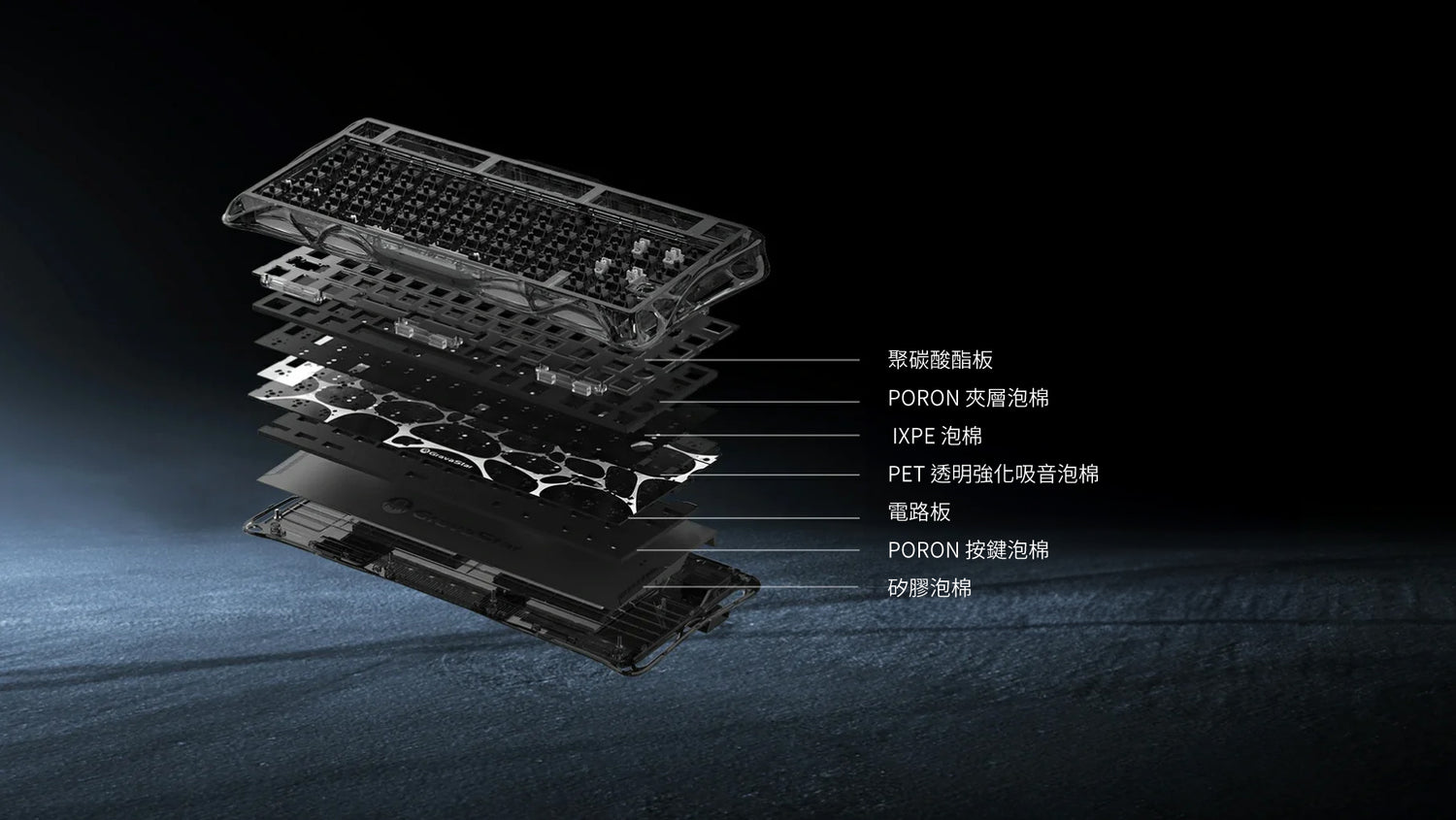 敲擊音較小,手感更柔和,透光度較低,打造平衡的打字體驗。多層隔音泡棉,吸收異音,集中反饋聲,潤緩打字手感。