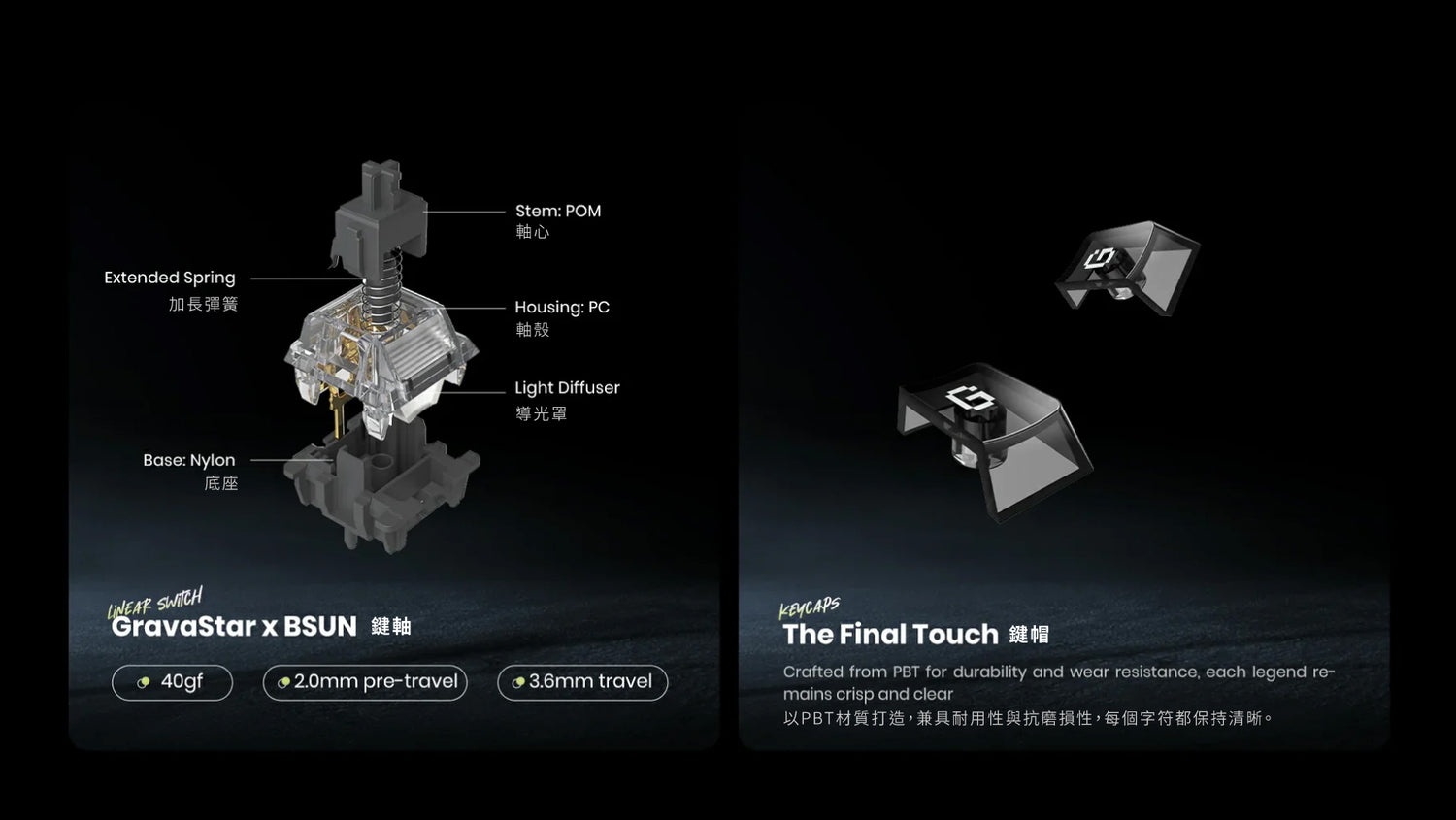 與軸體大廠 Kailh 合作,獨家開發 GravaStar 專屬軸體,直上直下的無段落手感,使敲擊帶些冰塊音,極其悅耳。