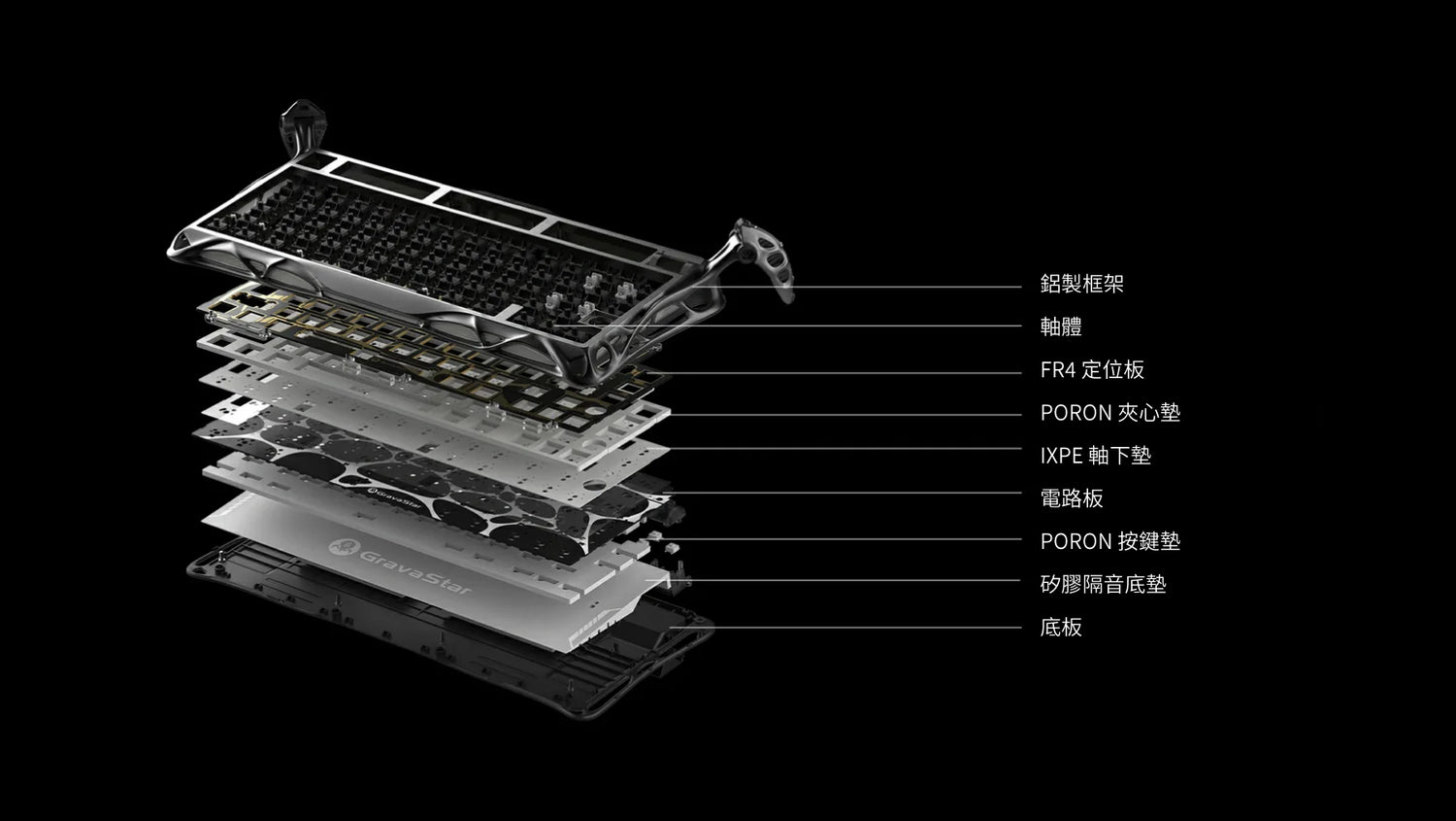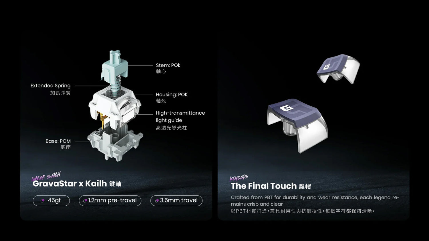 與軸體大廠 Kailh 合作,獨家開發 GravaStar 專屬軸體,直上直下的無段落手感,使敲擊帶些冰塊音,極其悅耳。