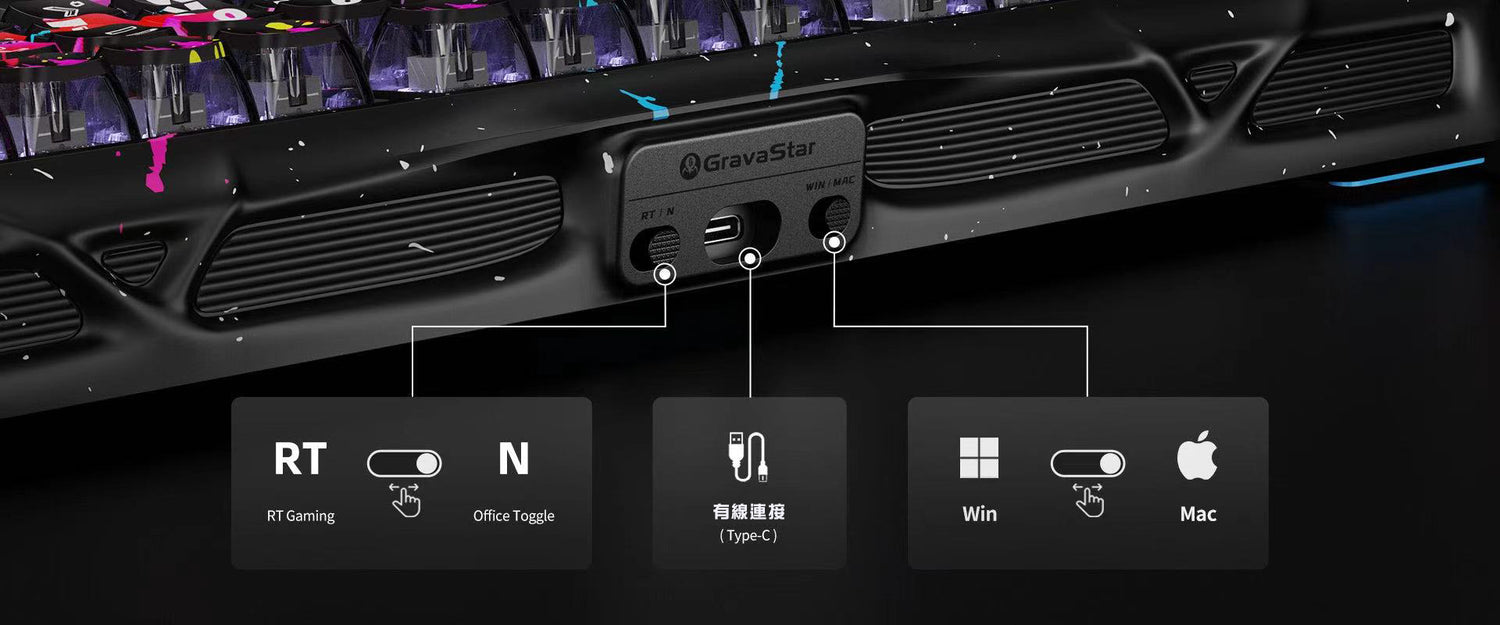 與軸體大廠 Gateron Magnetic Jade 合作,獨家開發 GravaStar 專屬軸體,直上直下的無段落手感,使敲擊帶些冰塊音,極其悅耳。